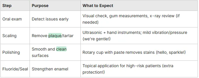 We'll review your health, do a thorough exam (maybe X-rays), then give your teeth a fantastic clean and polish. We'll also chat about home care and plan your next visit. You'll leave feeling fresh and informed!